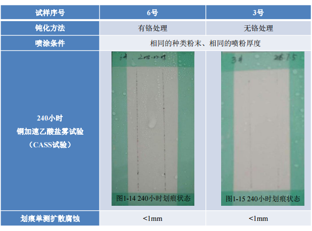全項(xiàng)測(cè)試結(jié)果:在涂層附著力,抗變型加工,耐乙酸鹽霧和耐銅加速乙酸鹽霧試驗(yàn)等各項(xiàng)指 標(biāo)方面,已經(jīng)全面超過了傳統(tǒng)的鉻化處理。